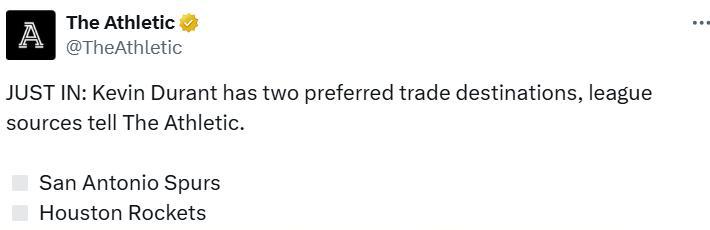 TA:杜兰特已明确两个心仪的下家,就是马刺和火箭 byxiaoqiao 发表于2025年06月19日 雷速体育6月15日讯 据美媒The Athletic报道,杜兰特已明确两个心仪的下家,就是马刺和火箭。本赛季常规赛期间,杜兰特场均可以得到26.6分6篮板4.2助攻。 你可能感兴趣的内容 下一篇文章 湖人内线引援四处撒网,又增加三大选项,两全明星中锋入围 发表于2025年06月19日 byxiaoqiao 查看文章 你可能会喜欢